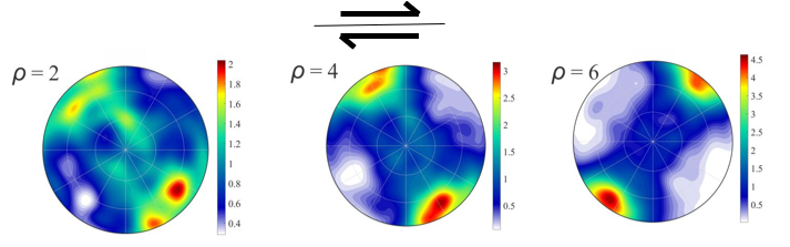 Flow variation in quartz aggregates of natural high strain zones in Earth’s lithosphere can influence the development of crystallographic fabric and cause problems in its interpretation. If such effect is not accounted for, crucial geological information such as deformation temperature, deformation history and shear sense obtained using crystallographic fabric can be seriously misinterpreted. Ankit developed and applied a multiscale model coupling Matlab-based MOPLA code with the Fortran-based VPSC code to simulate the quartz crystallographic fabric under partitioned flow. It was found that the quartz c-axis fabric variation showing apparent opposite senses of shear within a single thin section, can be explained by partitioned flow within the quartz domains and reflect finite strain gradient rather than reversal of vorticity sense as previously thought. Following image shows the quartz crystal fabric changing with increase in strain intensity. This only happens when quartz aggregates are rheologically stronger than the surrounding rockmass.